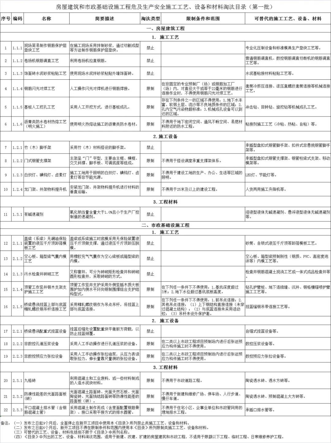 2021年12月14日,住建部印發的《房屋建筑和市政基礎設施工程危及生產安全施工工藝、設備和材料淘汰目錄(第一批)》明確: