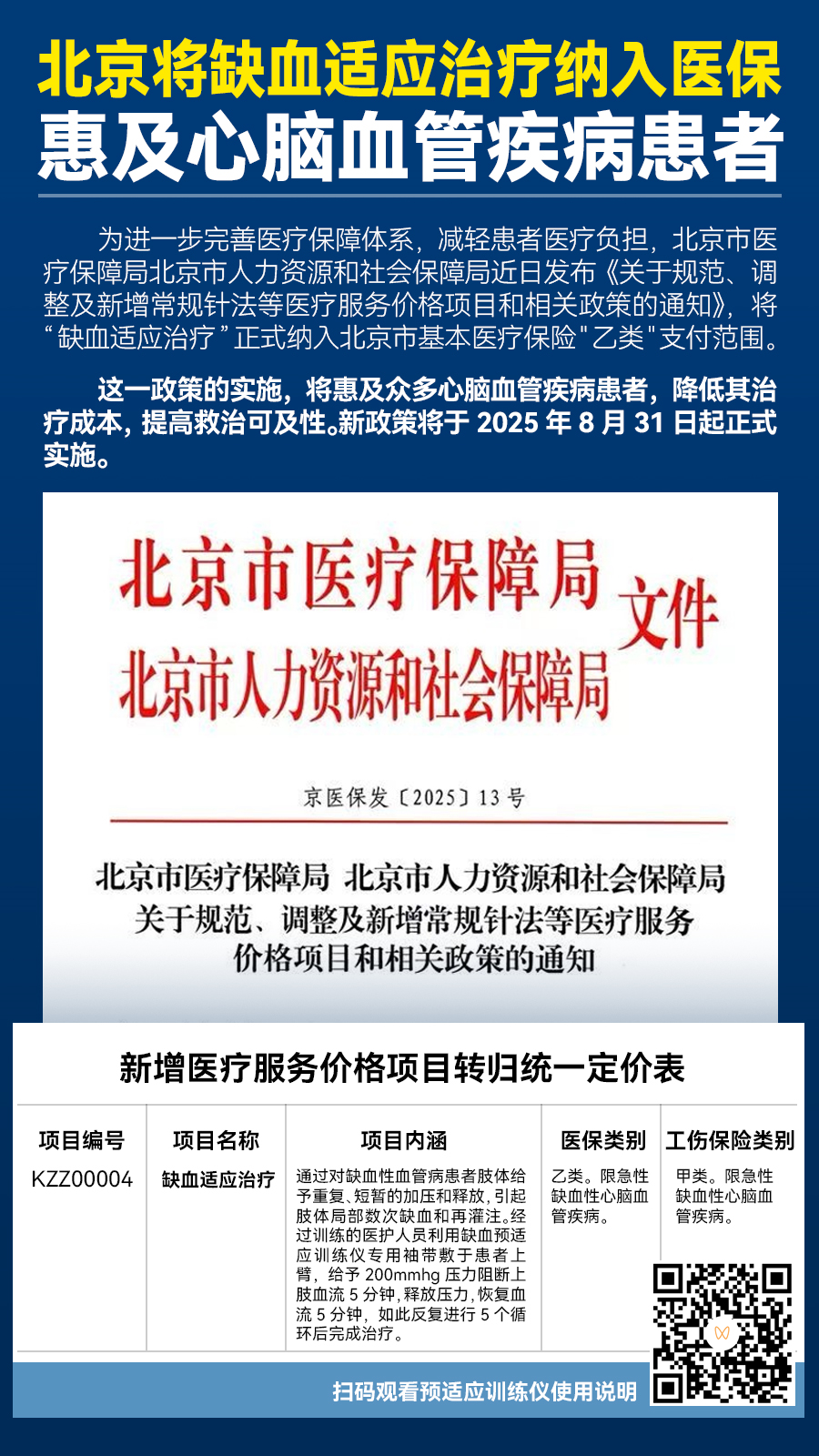 為進一步完善醫(yī)療保障體系,減輕患者醫(yī)療負擔,北京市醫(yī)療保障局北京市人力資源和社會保障局近日發(fā)布《關于規(guī)范、調(diào)整及新增常規(guī)針法等醫(yī)療服務價格項目和相關政策的通知》,將“缺血適應治療”正式納入北京市基本醫(yī)療保險"乙類"支付范圍。